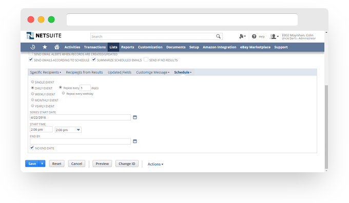 - Under "schedule" subtab, set daily schedule to run. Click blue "save" button and this email schedule should be complete.